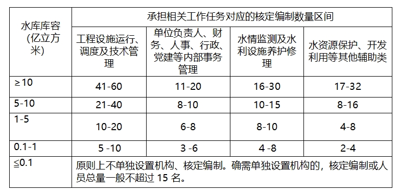 1.大中型水库管理机构:以水库库容为基本参考量,按以下标准核定和使用事业编制。