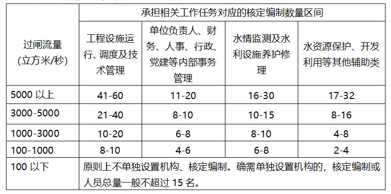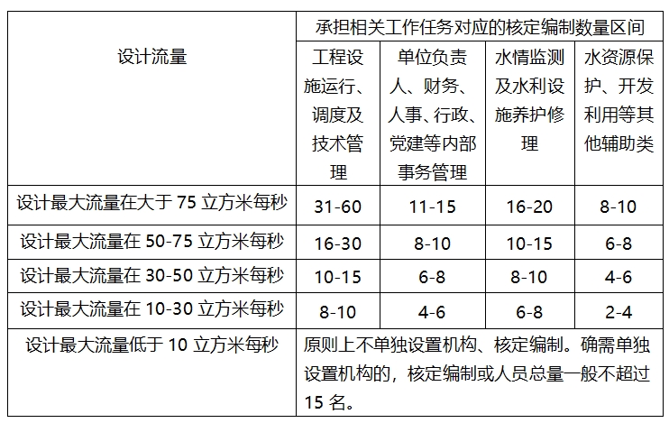 各地在具体核定水利服务工作机构的机构编制事项时,要按照中央关于严控总量、盘活存量、优化结构、增减平衡的要求,本着适应需要、从严掌握、配备人员编制与精简超编人员逐步到位的原则,合理设置机构、核定人员编制。