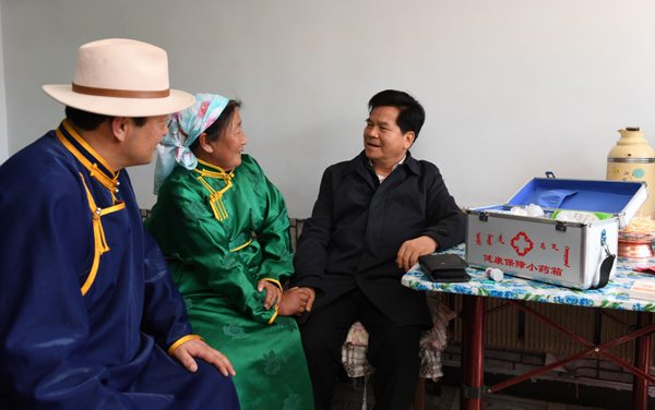 5月9日,自治区党委书记、人大常委会主任李纪恒来到锡林郭勒盟正镶白旗宝力根陶海苏木,走访贫困户阿拉腾苏布达家,了解健康扶贫落实情况。