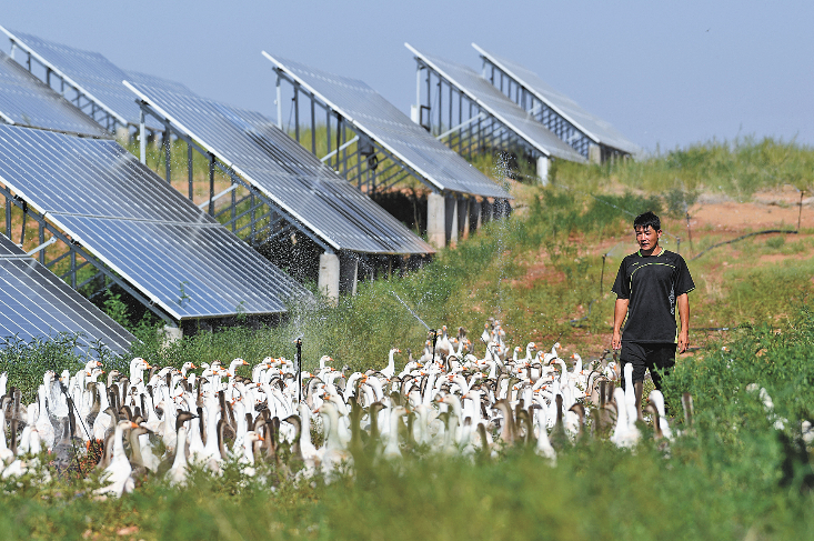 利用沙漠地区的广阔空间和充足太阳能,库布其首创了以“板上发电、行间种草、板下养羊”的立体空间土地利用模式,推动清洁能源发展。