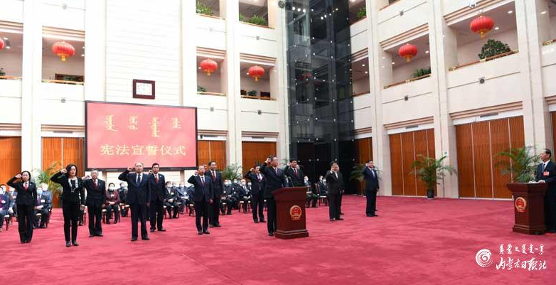 4月1日上午,自治区十三届人大常委会第十九次会议举行了宪法宣誓仪式。自治区党委书记、人大常委会主任石泰峰主持并监誓。图为新任职人员依法进行宪法宣誓。