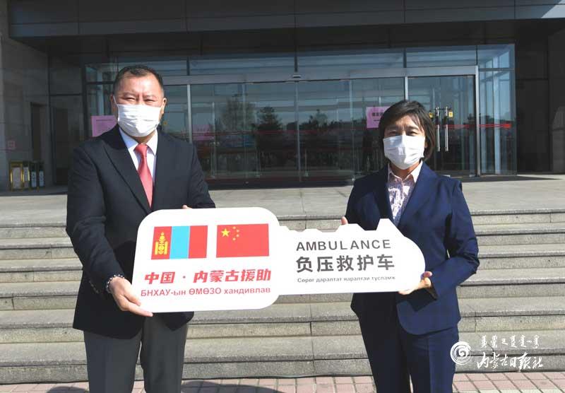 4月10日上午,中国内蒙古自治区人民政府向蒙古国乌兰巴托市捐赠医疗物资暨 “一带一路•光明行”蒙古国行动捐助仪式在呼和浩特举行。内蒙古自治区主席、红十字会名誉会长布小林出席活动,并向蒙古国驻呼和浩特总领事馆移交捐赠的负压救护车钥匙。